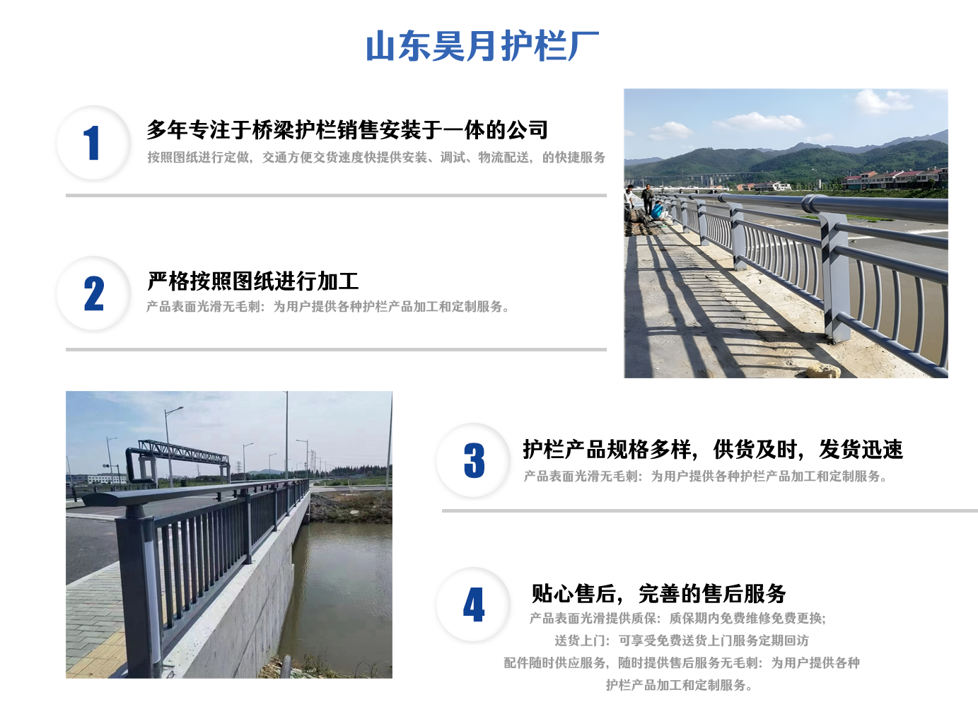 山東昊月金屬制品有限公司坐落于原材料豐富人文和諧交通發達及有“江北水城”之稱——聊城。 公司以科技興廠為宗旨,積極引進人才和技術,不斷開拓創新. 主營產品:SS級橋梁防撞護欄,不銹鋼復合管護欄,鋁合金護欄,燈光護欄,河道護欄等等。產品本公司建立了一套科學的行之有效的質量體系,擁有一支高技術、高素質團隊,堅持以“誠信”為本,堅持“優質的質量、貼心的服務”為崇高理念,為用戶提供質優價廉的產品提供至真至誠的服務。與客戶合作雙贏、攜手共創輝煌。  公司以科學的工藝、嚴格的質量管理、完善的服務理念、合理的銷售價格贏得了良好的聲譽,建立了密切和愉快的合作關系。多年來,我們一直以良好的品質、合理的價格,完善的質量保障體系,完善的售后服務為客戶提供周到的服務,滿足廣大客戶的需求。  我們以信譽求生存,以質量去競爭,以真誠換合作,以效益求發展,是我們的服務宗旨。我們積極主動與同行加強交流與時俱進,邁向新的歷程!我們竭誠歡迎您的咨詢和洽談,愿與同行業的同胞們合作共贏。...